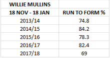 The table below tells an interesting tale of how Willie Mullins’ run-to-form percentage, based on sophisticated Timeform calculations, since Walsh was injured (69%) has dipped noticeably compared to the exact same period in the previous four seasons.