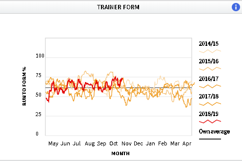 As the graph below shows, Jonjo O’Neill has enjoyed a better autumn than last year, and his Allelu Alleluia proved himself a much better chaser than hurdler when running away with a novices’ handicap at Worcester last month in first-time blinkers. His weakness in the market was noticeable once more, but that didn’t detract from his performance, winning with plenty in hand, and a subsequent 10 lb rise could well underestimate him if the headgear continues to have the desired effect.