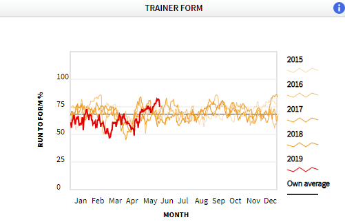 David Simcock admitted last month that he would have less ammunition to work with this season, especially at the highest level, with stable stalwarts Lightning Spear and Sheikhzayedroad amongst those who were retired at the end of 2018. His search for more horses of that calibre is going to be a work in progress for a while longer yet, but he will at least have been encouraged by the fine form of the yard in recent weeks – as demonstrated by the graph below – and there is seemingly plenty to look forward to in the coming days, too, with plenty of entries for a stable ‘lacking ammunition’.