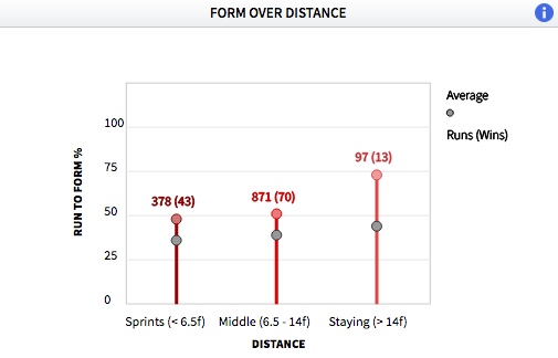 Rod Millman’s stayers (those running over a mile and a three quarters or more) run to form 73% of the time, significantly more than the average of 44%: