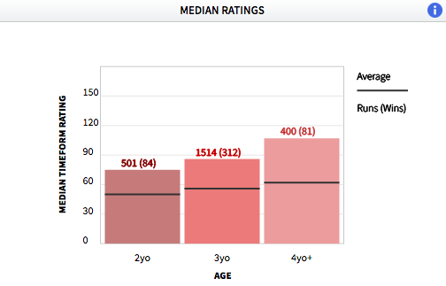It isn’t a surprise to see that a trainer’s highest-rated horses are those aged four and above, but Sir Michael Stoute’s median rating with his older horses (107) is higher than many other big yards: