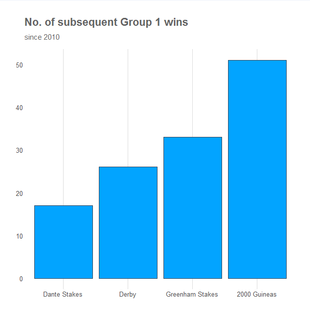 This shows that the Greenham has been something of a mini-classic itself in terms of the quality horses it has produced, even outperforming the Derby in number of subsequent Group 1 wins (though of course the Derby is later in the season, and a win in that race usually means a swift call up to stud).