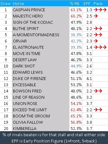 The above table is arranged in draw order and uses the 10 most recent runnings of this race to measure achievement by % of rivals beaten for the stall in question and the stall on either side (which reduces variance by increasing relevant sample size).