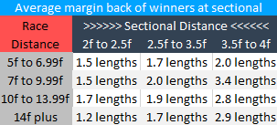 Among other things we can establish are the average margins back from the leaders, at the various sectionals, of race winners for the entire Archive, as follows: