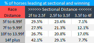 More informative still are the %s of horses who were in the lead at the sectional and went on to win:
