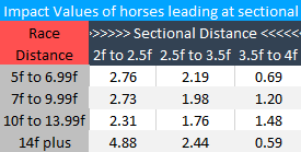 All 14 races at 7f to 9.99f at Naas did not go to the leader at the sectional (a variety of sectional distances had to be used, which is why it does not show in the table). The impact values for Newbury were low at all distances, with a 4f sectional most often in use at the course due to camerawork.