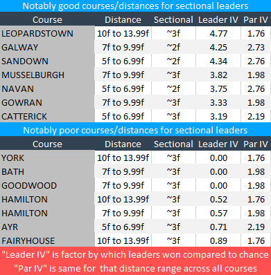 At the other end of the scale, those figures for 10f to 13.99f at Leopardstown, 7f to 9.99f at Galway and 5f to 6.99f (in reality, 5f) at Sandown are remarkably high, with horses which led at the sectional winning more than four times as often as chance.