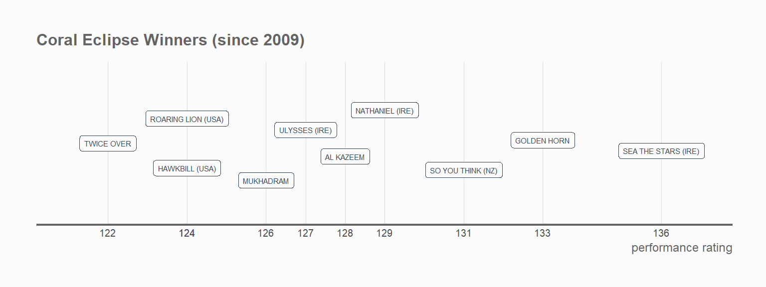 Back to the Eclipse, the visualisation below shows the last 10 renewals and the performance ratings of winners, ranging from Sea The Stars (136, 2009) back to Twice Over (122, 2010). To win an average renewal, this year's participants would be required to post a figure of around 127.5.